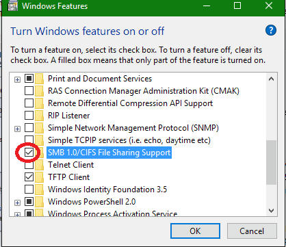Your PC is running Windows 10 check if SMB 1.0 future is enable